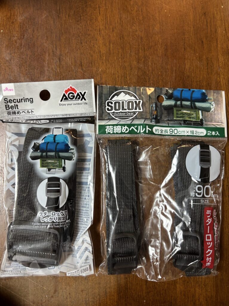 私は同じくダイソーで、👇のヒモを買ってきて、キャリーとタックルボックスを固定しました。