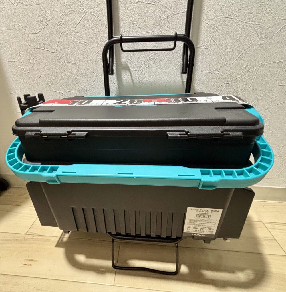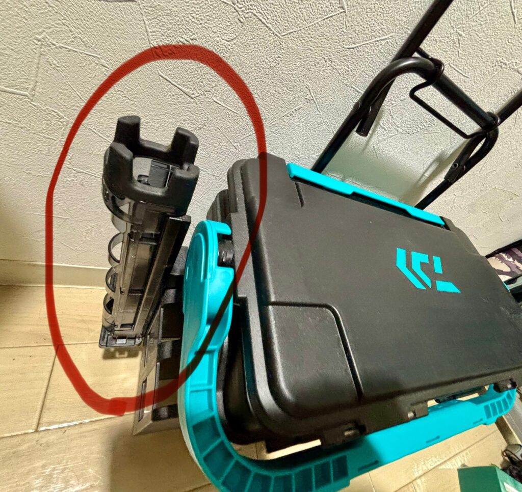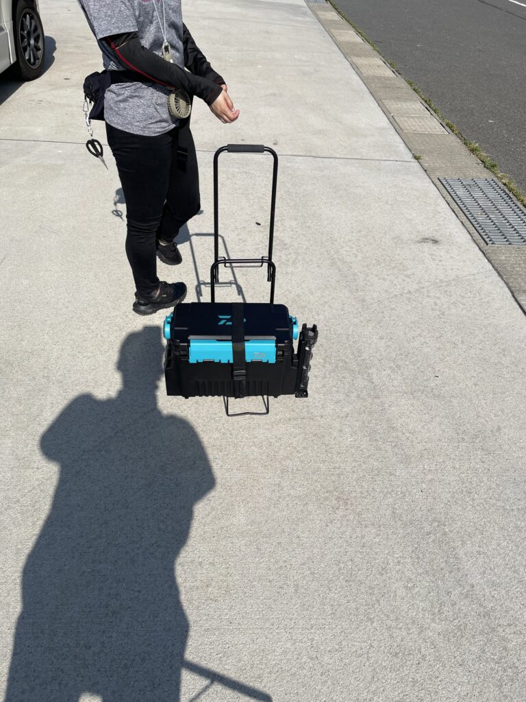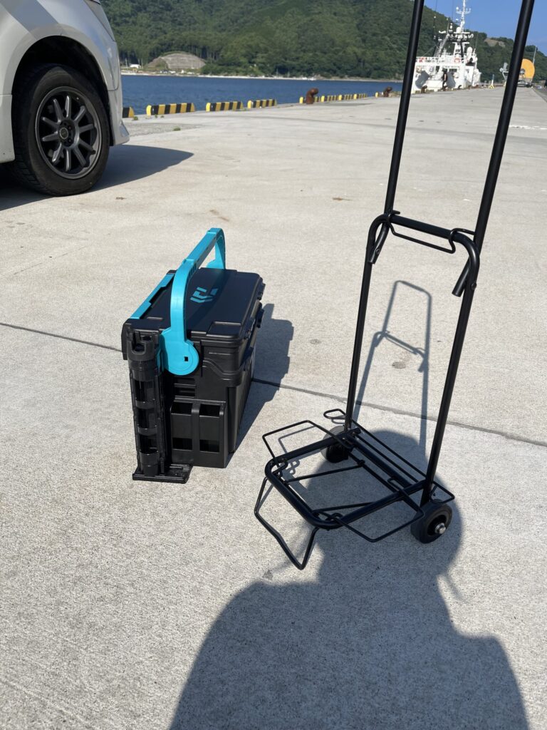 なんならちゃっかり、ロッドホルダーも付けて、それ以上の幅はありますが、荷物を運ぶ分にはこのサイズ感の同じタックルボックスなら、問題なく使えるかと思います。