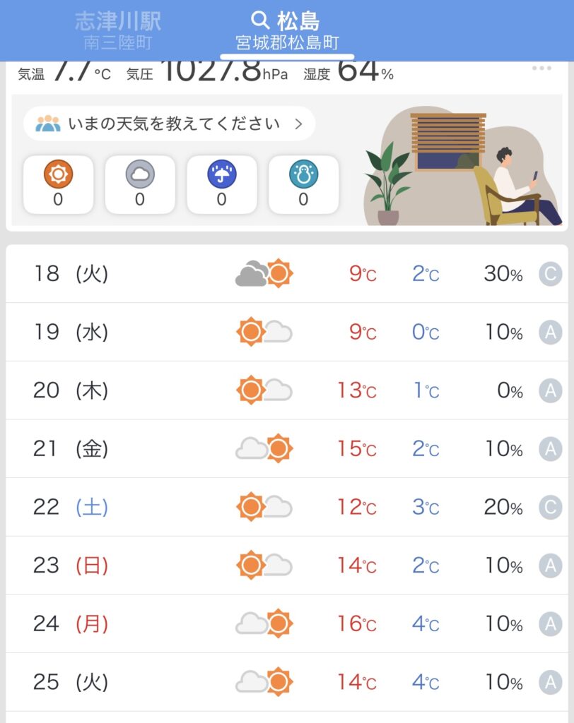 宮城の今年の11月の気温は、最高が高くて15度。最低気温が5度くらいです。