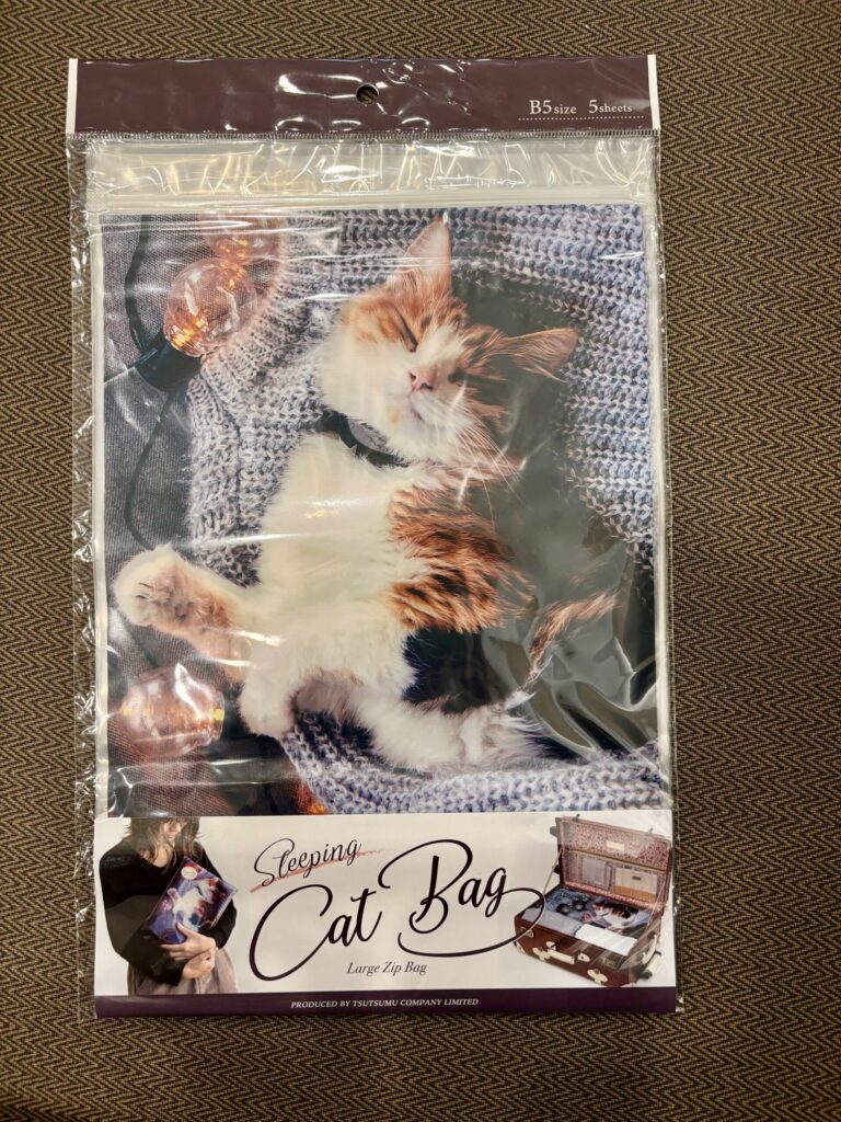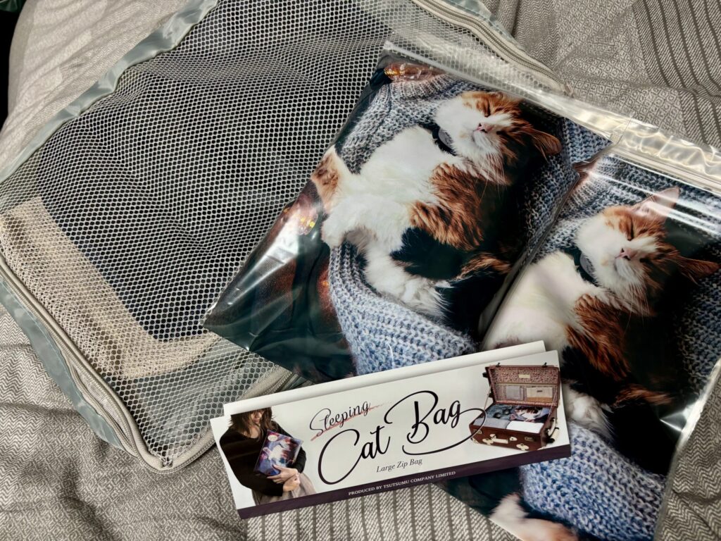 こんな感じで、他のメッシュバッグの他に、大事な下着やタオル類などを、このジッパーバッグに分けて入れていくと、旅行の準備の時も猫ちゃんの癒し効果で、はかどるかもです。